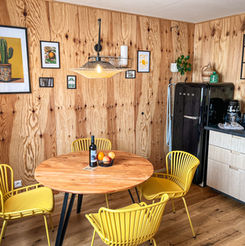 Die voll ausgestattete Küche mit angrenzendem Essbereich ist in warmen Naturholz gestaltet , ein gemütliches Schlafsofa bietet Platz für 2 Kinder.