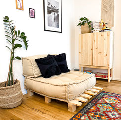 Die Flat 3 liegt ebenfalls im Erdgeschoss und besteht aus einem hellem Schlafzimmer & Wohnraum mit Doppelbett und grossem Sofa.